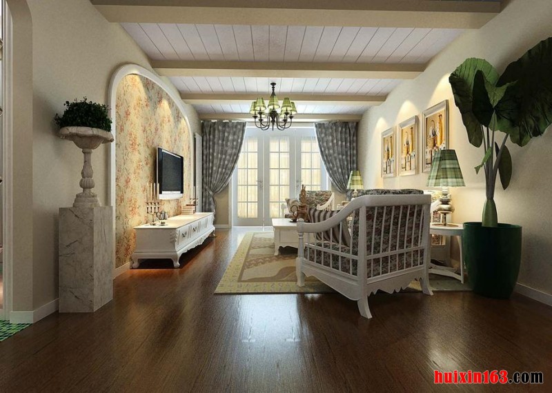 此套设计整体色调淡雅别致、清新自然,风格显得格外简洁明快,时尚现代。十分符合设计风格特点。案例中大量使用木质家居用品和建材,例如沙发组套和茶几的象牙白色木质,与电视柜的象牙白色木质,再与电视背景墙的象牙白色拱形镶边木质,最后到顶棚的白色复合材料质地,白色点缀了整个空间的色彩平衡,地板采用实木地板,墙纸采用咖色壁纸与复合材料相结合的方式,顶棚采用复合材料吊顶的形式,而且以粗犷的线条勾勒出极尽简约之感,一举两得,省心省力。