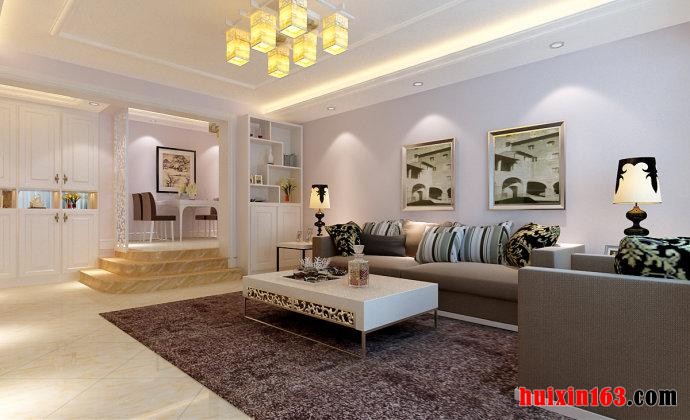 本套房屋的装饰主要以白色为主,客厅中的色彩搭配对比性比较大,一款深灰色的沙发摆放在纯白的墙壁前,将其显得更加高档、大气,墙壁上两幅装饰画显得格外富有意境,沙发所搭配的抱枕也显得更加时尚,地面上一款棕色的毛绒地毯,为客厅带来了一丝温馨之意,平顶式的石膏板吊顶的设计使房间显得更加大气,落地窗前的双层窗帘更是为客厅增添了一份柔美。